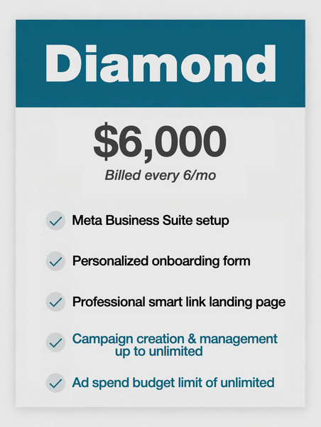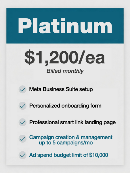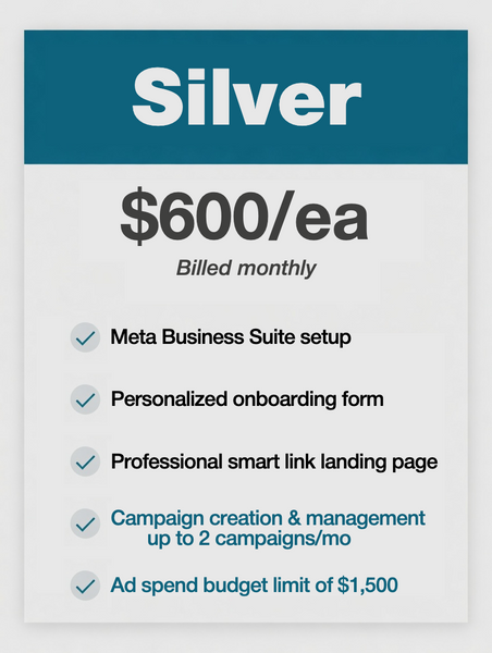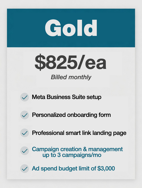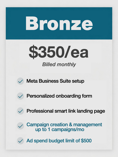 All of our packages work on a month to month basis. The price you see here does NOT include ad spend. Facebook will charge you directly for the ad spend. For example, if you plan on purchasing the $350 "Bronze Package" you'd still need additional budget for the ad spend. Usually $250-500. So your total cost would range from $600-$850 for the month.