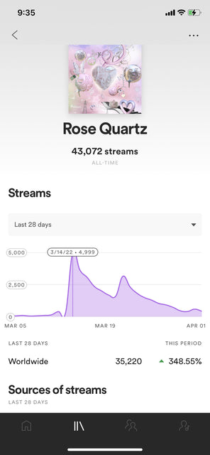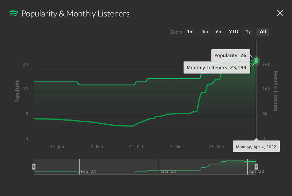 Montana Janel hired us in January 2022 to help promote her new single “Rose Quartz” releasing February 11th, 2022. With a $500 budget for a one month campaign, we were able to help Montana hit the Discover Weekly algorithm a month after release bringing the total numbers of streams on the song to over 43,000 streams in just two months. At the peak of the push, Montana was able to get 4,999 streams in a single day. This push not only helped the streaming numbers, but also made a massive difference on her monthly listener count. On release day, Montana had 5270 monthly listeners, but following the campaign, as of April 4th 2022, she now holds an impressive 25,194 monthly listeners, an increase of over 378%. Not to mention, on her campaign, only focused on the top tier countries such as the United States, Canada, Australia, and Western Europe (the top music markets in the world).