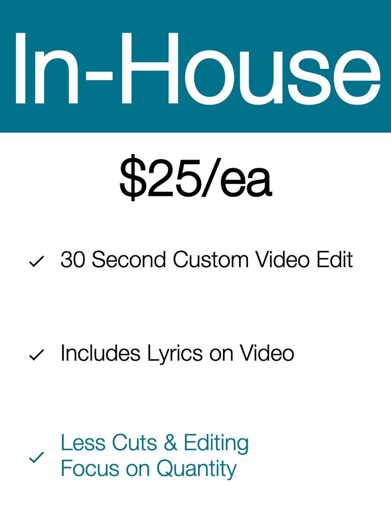 In-house video editing done by the team at Waves Music Marketing. Max 30 seconds in length & includes lyrics. The main difference between in-house & premium editing, is the amount of cuts & editing done. The premium editing will go above and beyond & really come across as a premium video. Whereas in-house, is more so to provide more quantity for the same price, while still remaining in the same video style & format as our premium editing.